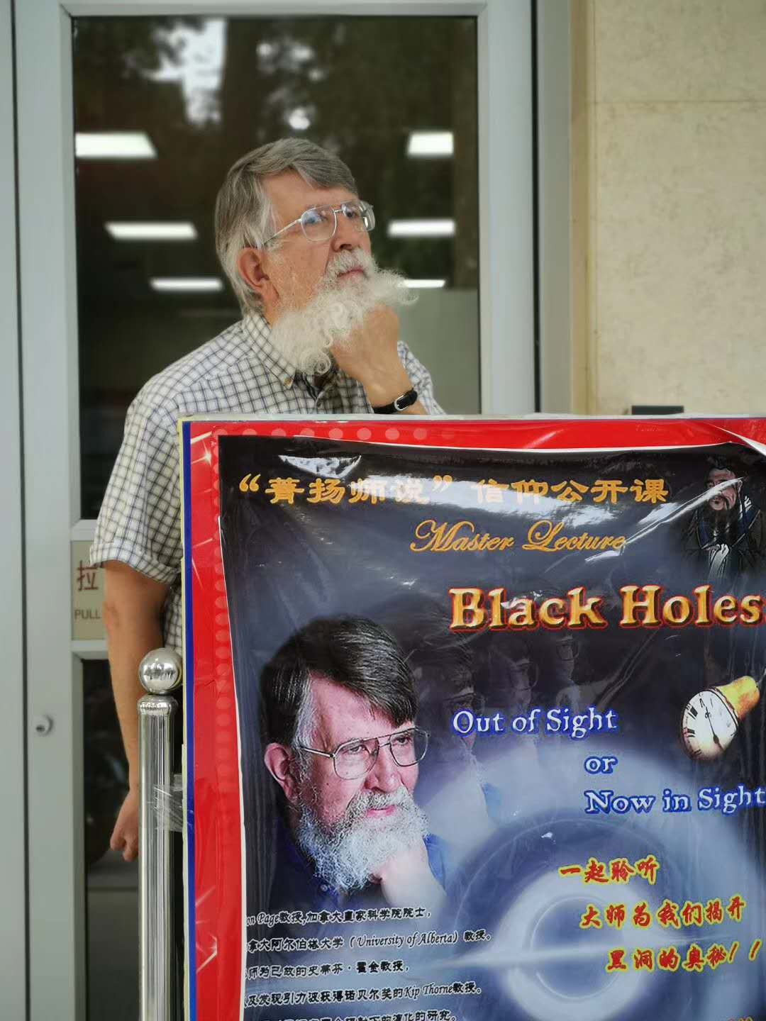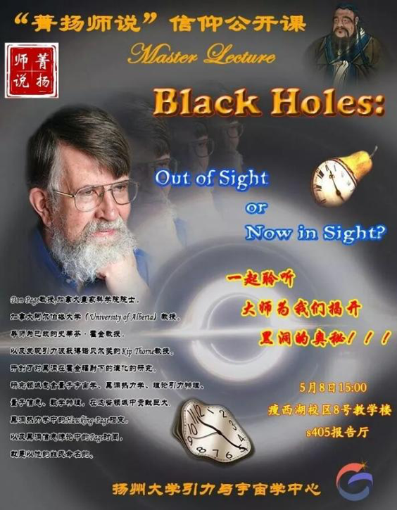 CGC invited Prof. Don Page from University of Alberta to visit Yangzhou University on May 8, 2019. Prof. Page, a well-known gravitational physics expert (notably due to his work in Hawking evaporation), is the member of The Academy of Science of the Royal Society of Canada. He obtained his Ph.D. from Caltech in 1976. His mentor is Prof. Stephen Hawking and Prof. Kip Thorne (Nobel laureate 2017). He gave a public lecture named “Black Holes: Out of Sight or Now in Sight?”.