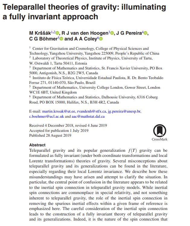 CGC former postdoc Dr. Martin Krššák, who spent 2019-2020 in our center, was awarded the Top Cited Paper Award in China (2022) for the review paper “Teleparallel theories of gravity: illuminating a fully invariant approach” [Class.Quant.Grav. 36 (2019) 18, 183001], of which he served as the corresponding author.